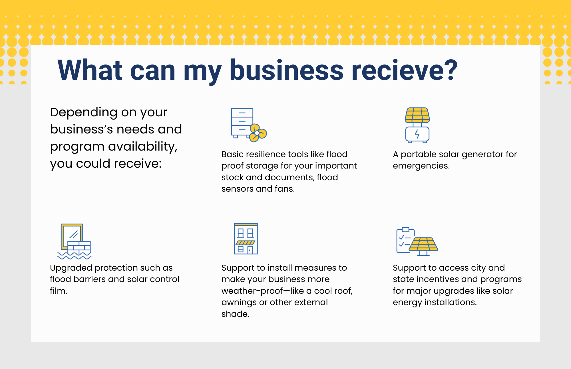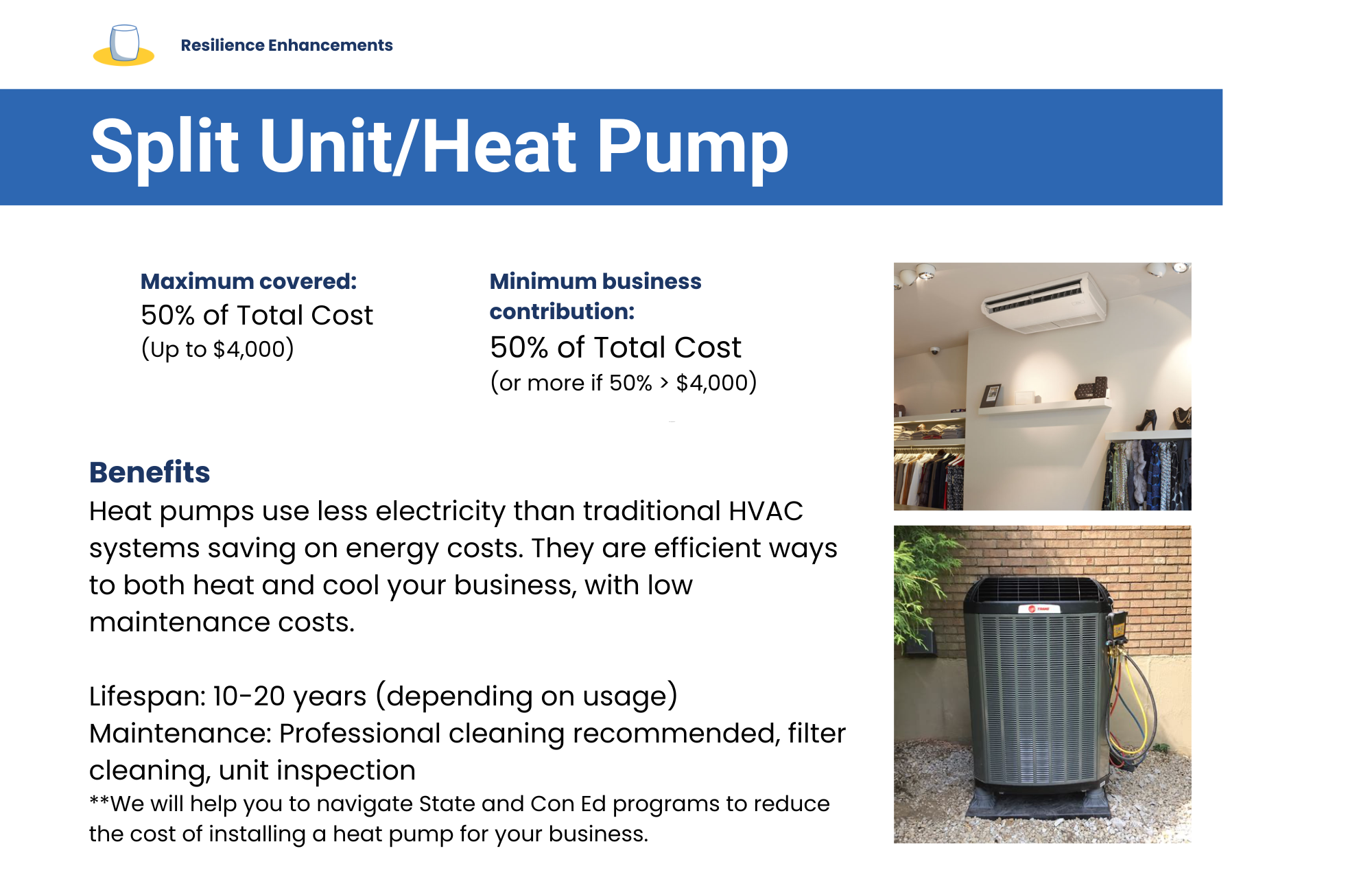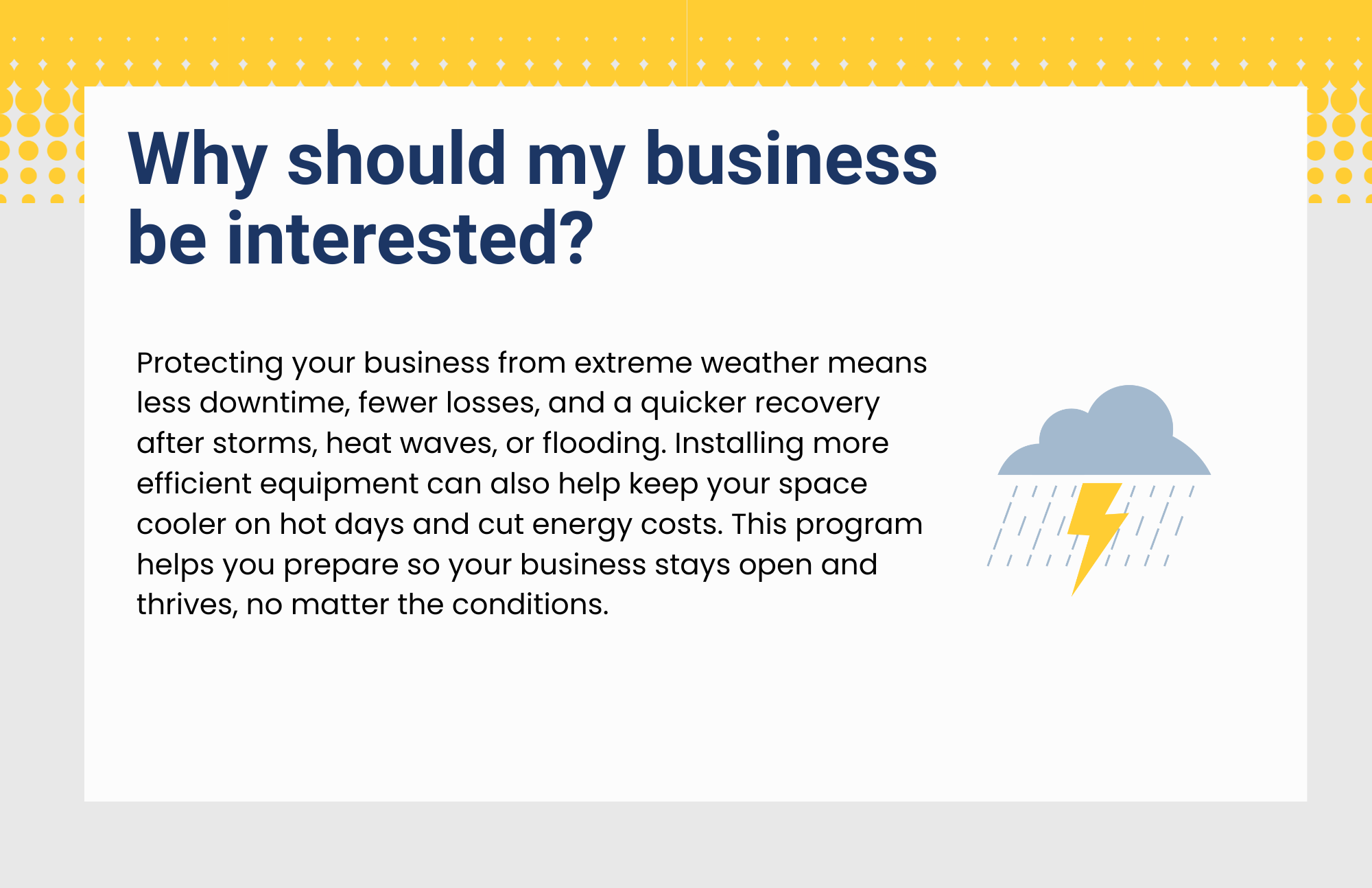 Protecting your business from extreme weather means less downtime, fewer losses, and a quicker recovery after storms, heat waves, or flooding. Installing more efficient equipment can also help keep your space cooler on hot days and cut energy costs. This program helps you prepare so your business stays open and thrives, no matter the conditions.