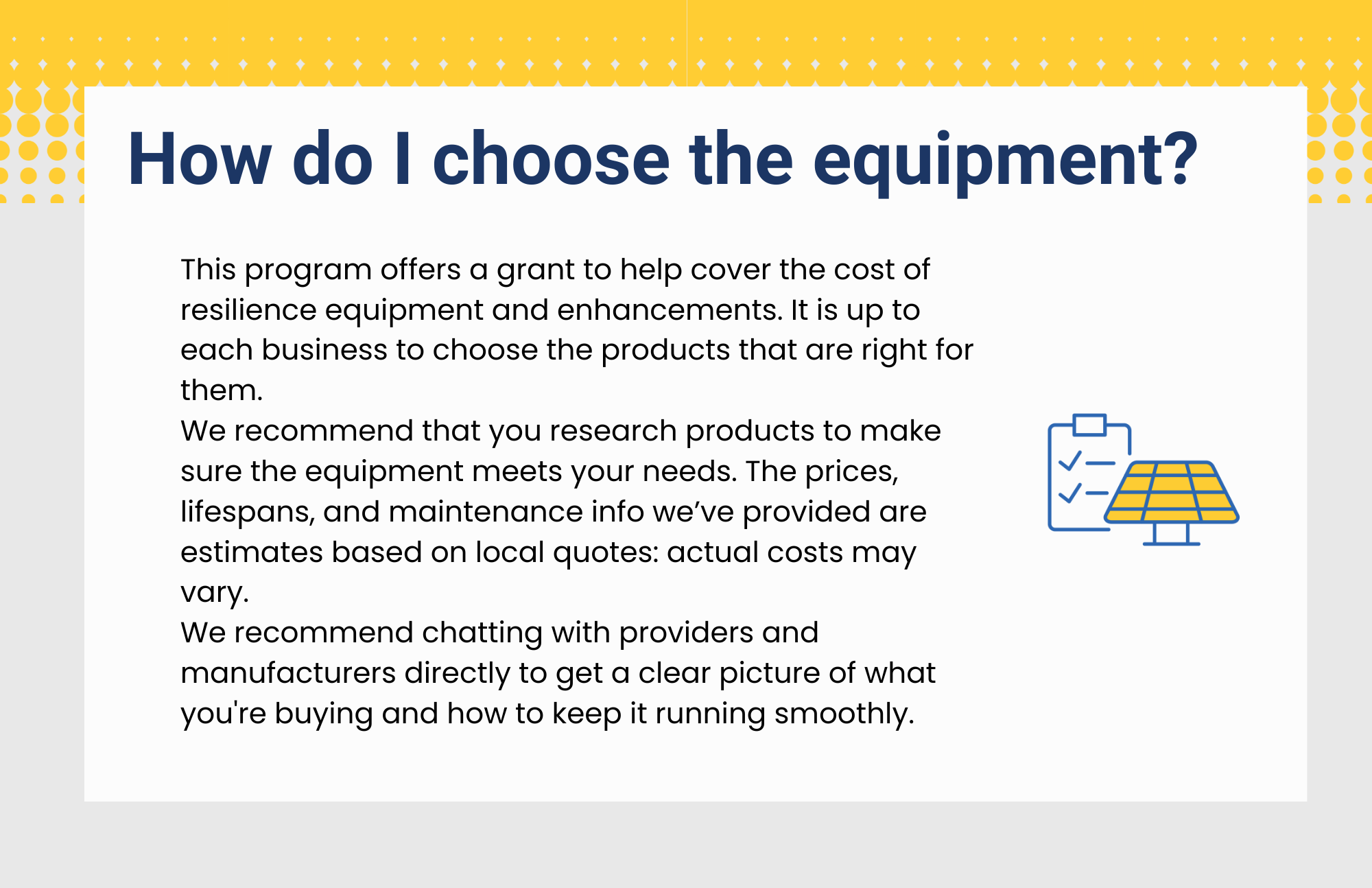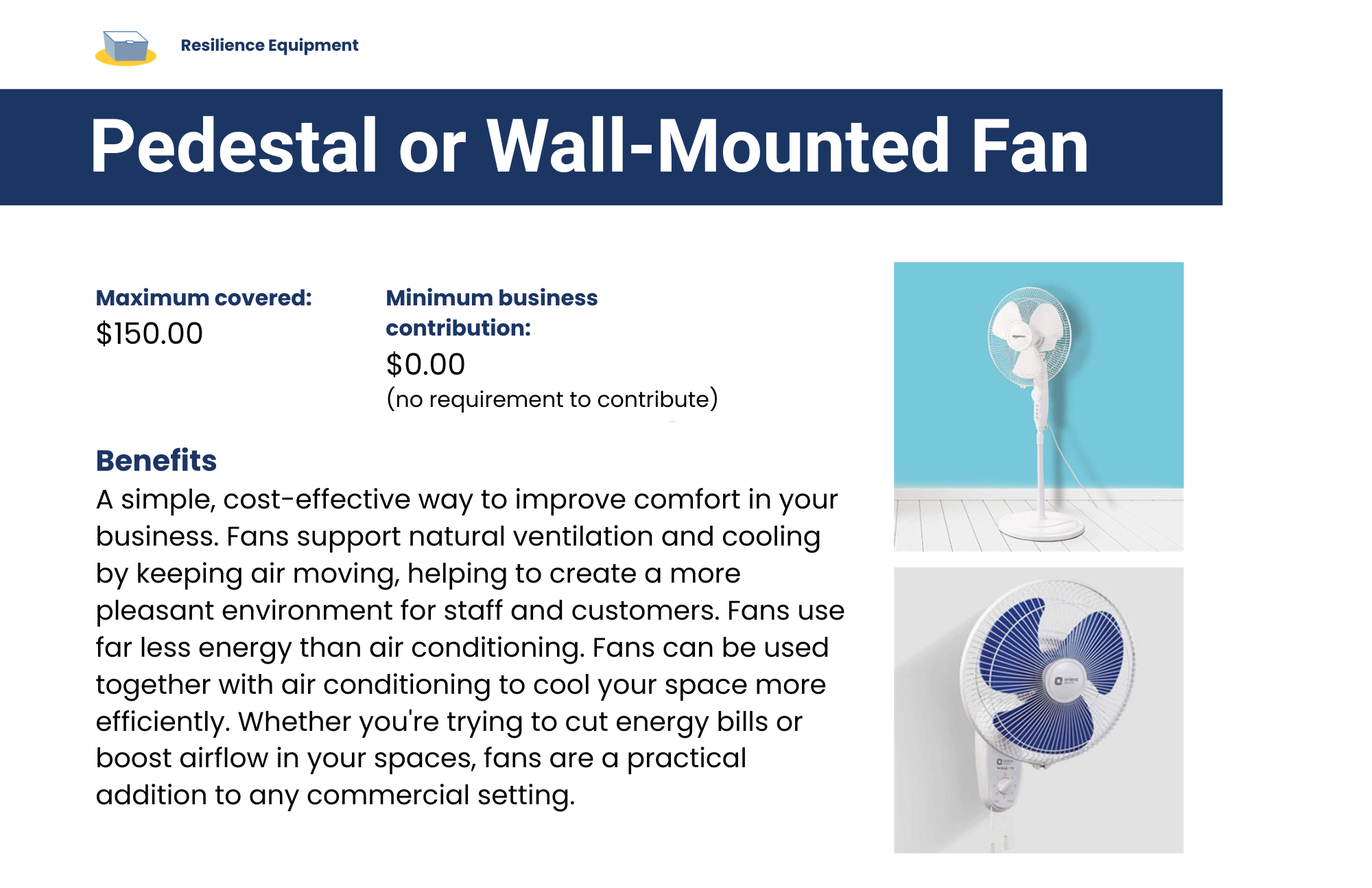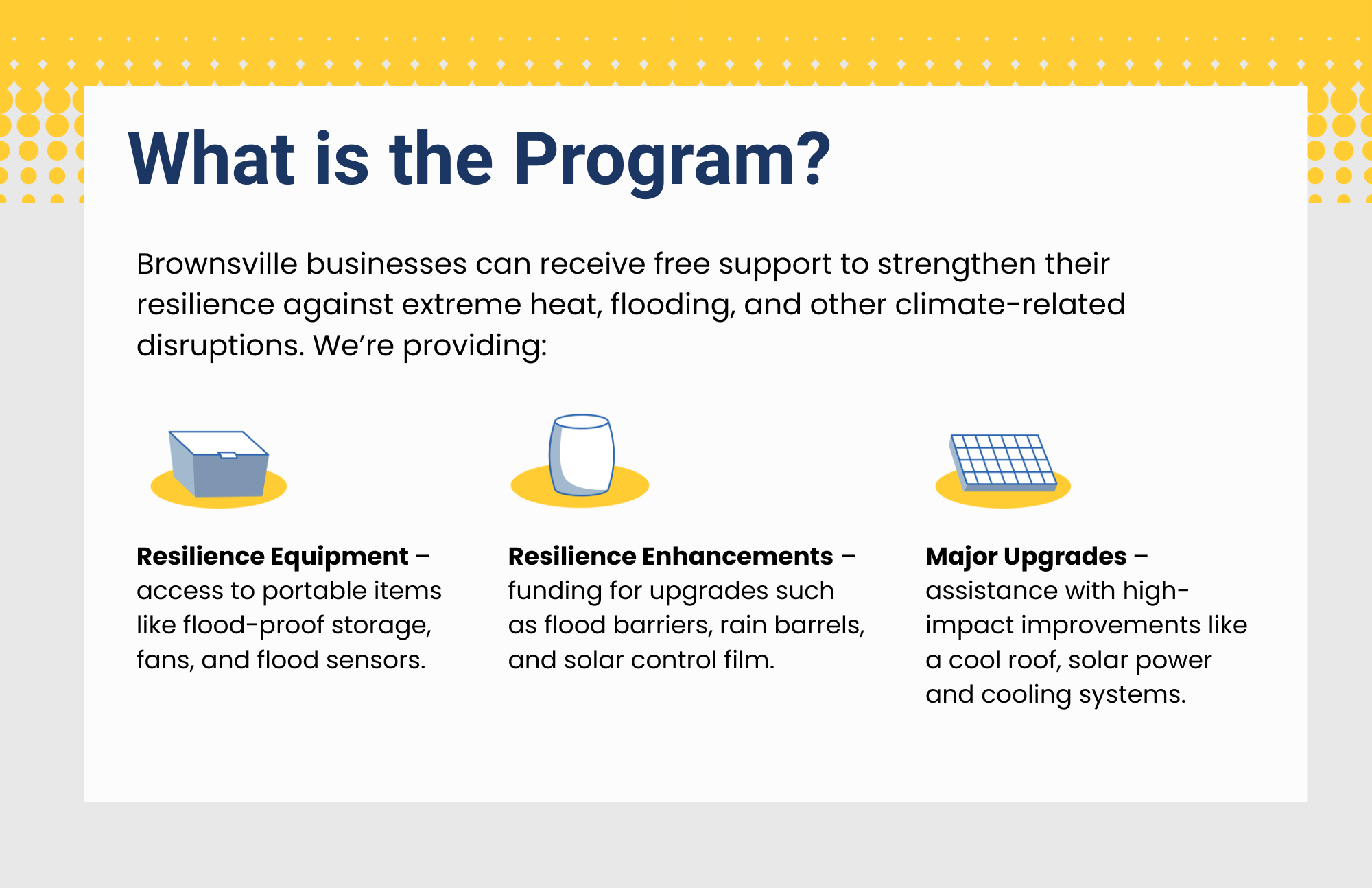 Protecting your business from extreme weather means less downtime, fewer losses, and a quicker recovery after storms, heat waves, or flooding. Installing more efficient equipment can also help keep your space cooler on hot days and cut energy costs. This program helps you prepare so your business stays open and thrives, no matter the conditions.