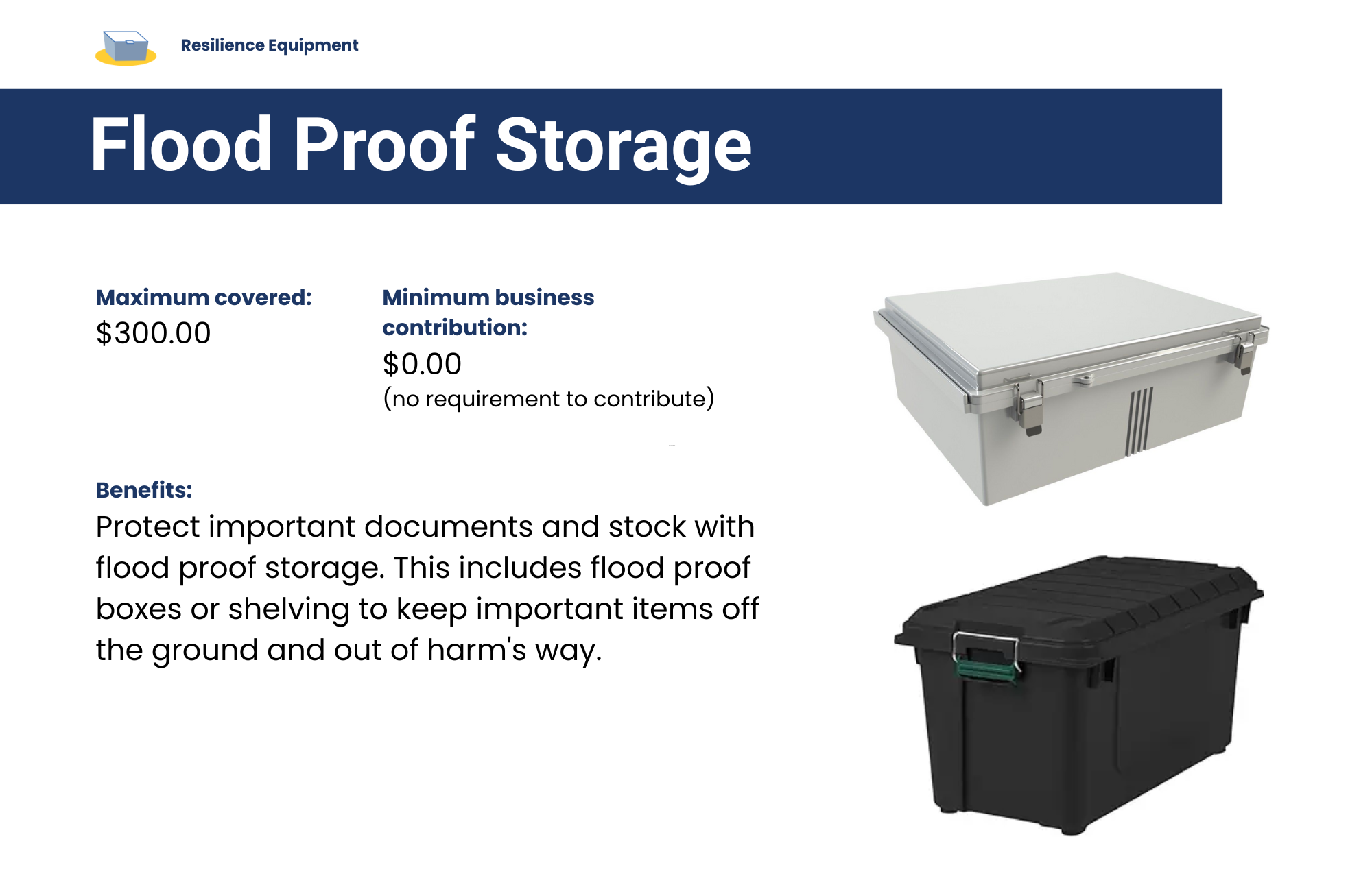 Protect important documents and stock with flood proof storage. This includes flood proof boxes or shelving to keep important items off the ground and out of harm's way.