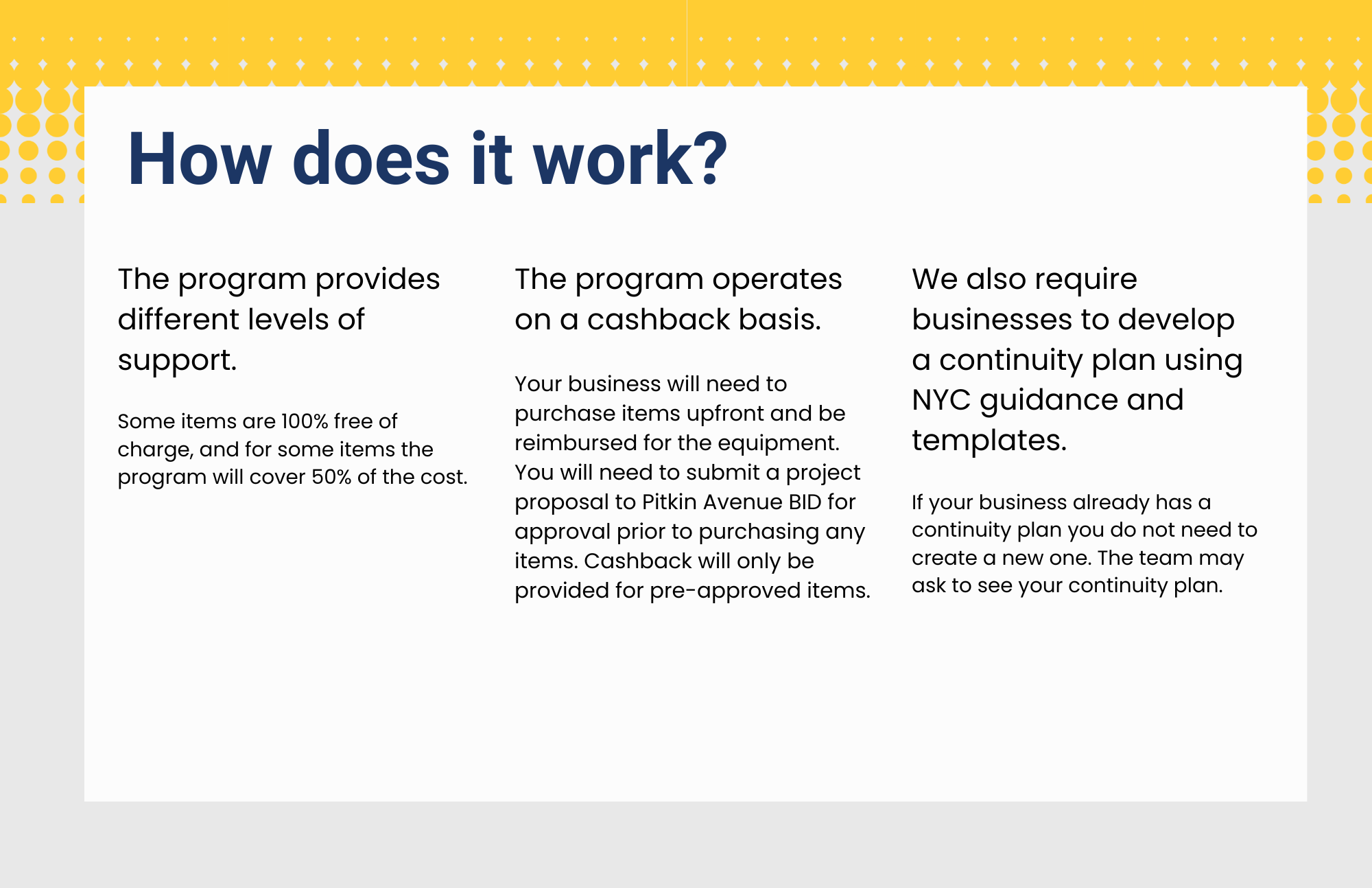 You will need to submit a project proposal to Pitkin Avenue BID for approval prior to purchasing any items. Cashback will only be provided for pre-approved items.