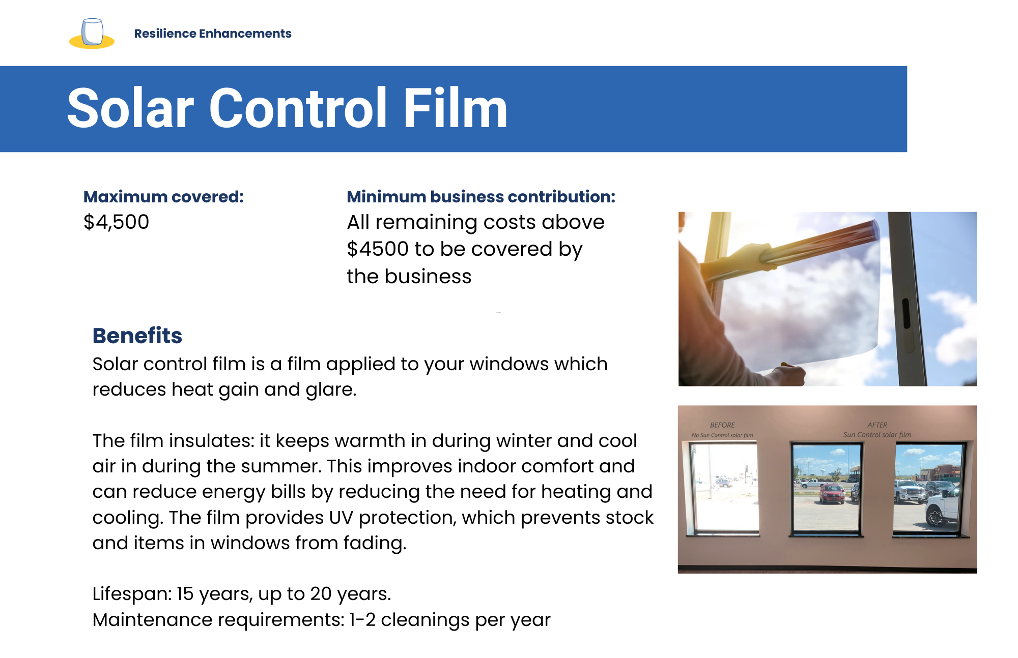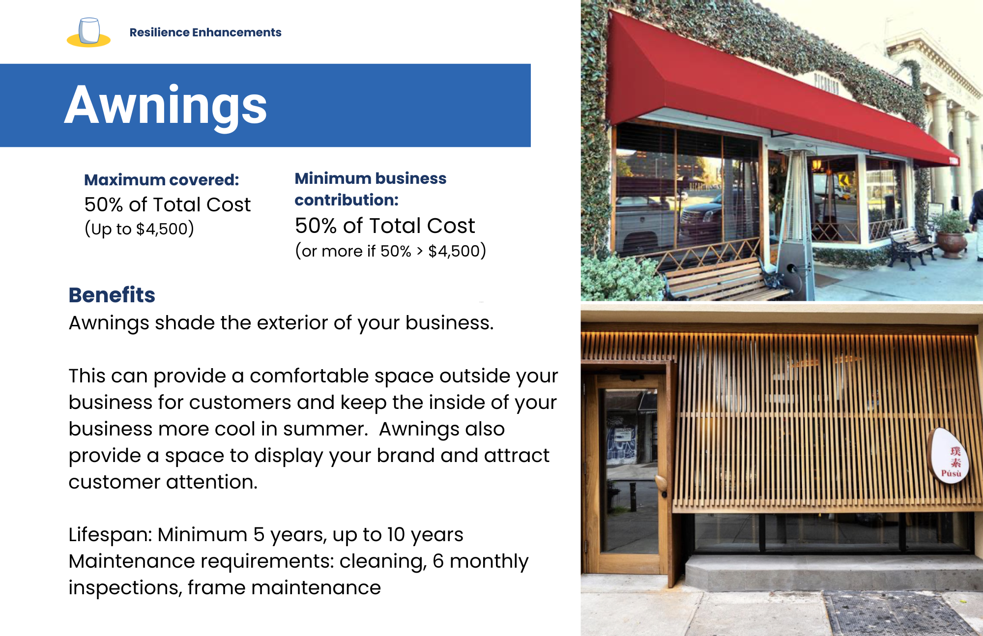 Support to install measures to make your business more weather-proof—like a cool roof, awnings or other external shade.