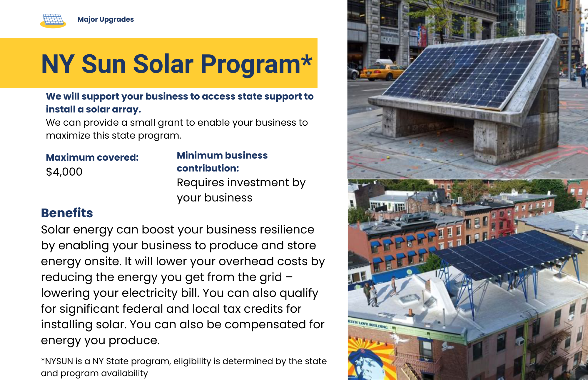 Major Upgrades – Assistance with high-impact improvements like a cool roof, solar power, cooling systems and [other eligible projects?